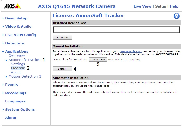 For application, contact AxxonSoft help-desk. You will be given a license code that you must register along with camera's MAC address on Axis website in order to get the license file.
