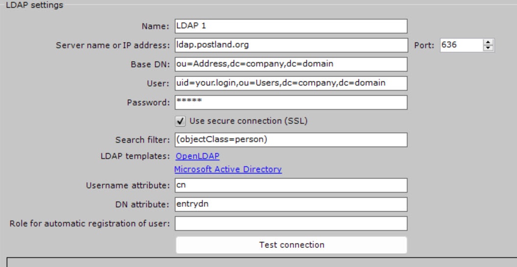 - In the Role for automatic registration of user field, enter a role, to which new users of the LDAP catalog are automatically added. If you don't specify a role, automatic user creation for this catalog is disabled.