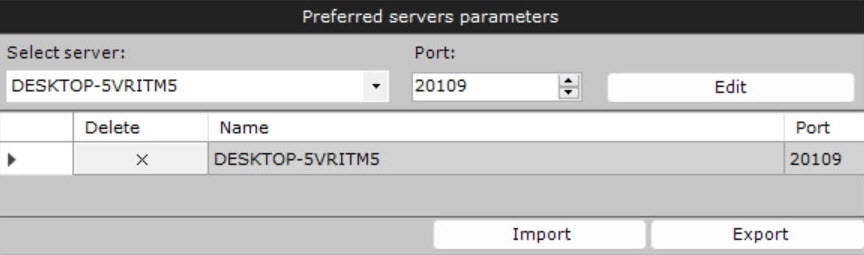 To save the configuration of the automatic connection to servers and preferred servers (see Selecting Preferred Servers) to a JSON file, click the Export button.