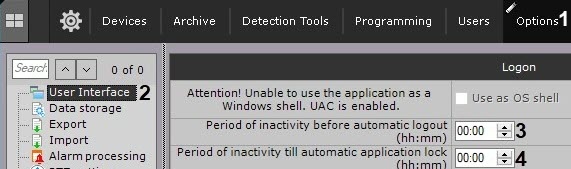 You can set the system to automatically log out of the Client and/or lock the Client if the user is inactive for a certain period of time, that is, there are no signals from input devices (keyboard, mouse, joystick).