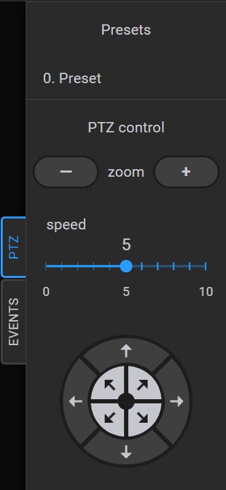 A PTZ video camera is controlled through the PTZ device control panel. To open the panel, click on the video surveillance window that contains a live video camera which supports a PTZ control interface. As a result, the PTZ tab will open on the right side panel. Clicking on the PTZ tab to control the PTZ camera.