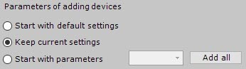 1 | Add device with default settings | The IP device is added to the configuration with the default settings (the default settings are determined by Axxon One itself). Adding a device in this mode will change the current settings of the device. |