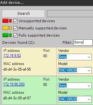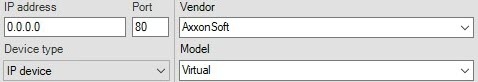 If an IP device is not shown in the search results (because it is located on another subnet or contact has been temporarily lost), you can add it manually. To do so, in the neutral-colored area above the search results, select the type of IP device that you are adding (with or without edge storage), specify an IP address and port, and select the manufacturer and model.