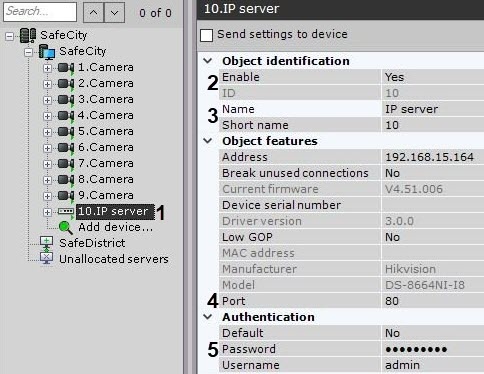 Configuration of IP server channels must be performed separately for each channel (with the help of child objects of Camera).