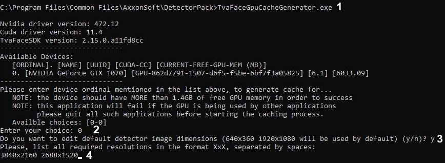 DetectorPack 3.8 부터 Face Recognition Pack 애드온에 Axxon One을 사용하지 않고 GPU 네트워크 캐시를 생성할 수 있는 유틸리티가 추가되었습니다 (DetectorPack 애드온 설치 참조). 캐시가 있으면 초기화 속도가 빨라지고 비디오 메모리 사용이 최적화되며 기본 얼굴 인식이 GPU에서 올바르게 시작되고 작동할 수 있습니다.