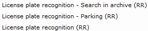번호판 인식 − 아카이브 검색용 (RR) − 아카이브에서 번호판을 인식합니다. 인식은 Fast 모드(최대 30 FPS의 영상 스트림 처리 속도)로 수행됩니다.