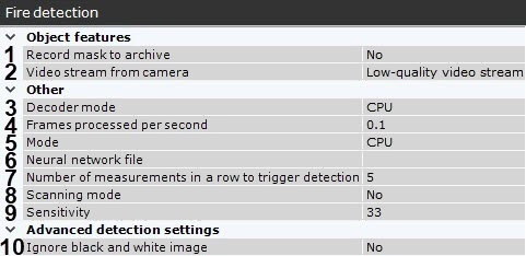 기본값(출력용 프레임 5개, 0.1 FPS)은 도구가 50초 동안 프레임을 분석함을 의미합니다. 검출 도구는 10초마다 한 프레임을 분석하며, 5개 연속 프레임에서 연기/화재가 감지되면 경보를 발생시킵니다.