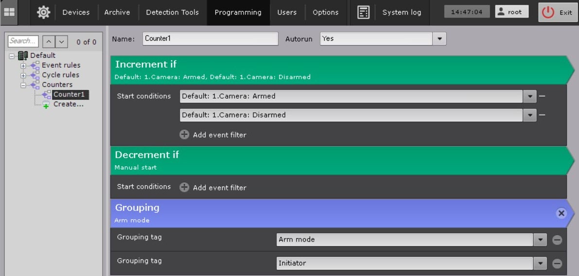 카운터는 하나의 Axxon 도메인 내에서만 작동합니다. 다른 Axxon 도메인에 속한 객체는 증가 조건 및 감소 조건에 사용할 수 없습니다.