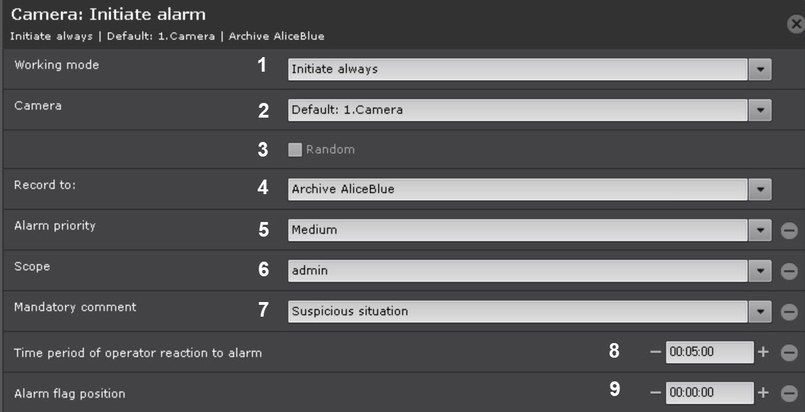 이전 단계에서 카메라 그룹 또는 Axxon-domain을 선택한 경우, 이 그룹/Axxon-domain에서 임의의 카메라에 알람을 시작하려면 Random(3) 체크박스를 설정합니다.