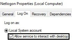 Allow interaction of the server NGP Host service with the desktop: Start → Control Panel → Administrative Tools → Services → Net Logon → Properties → Log On.