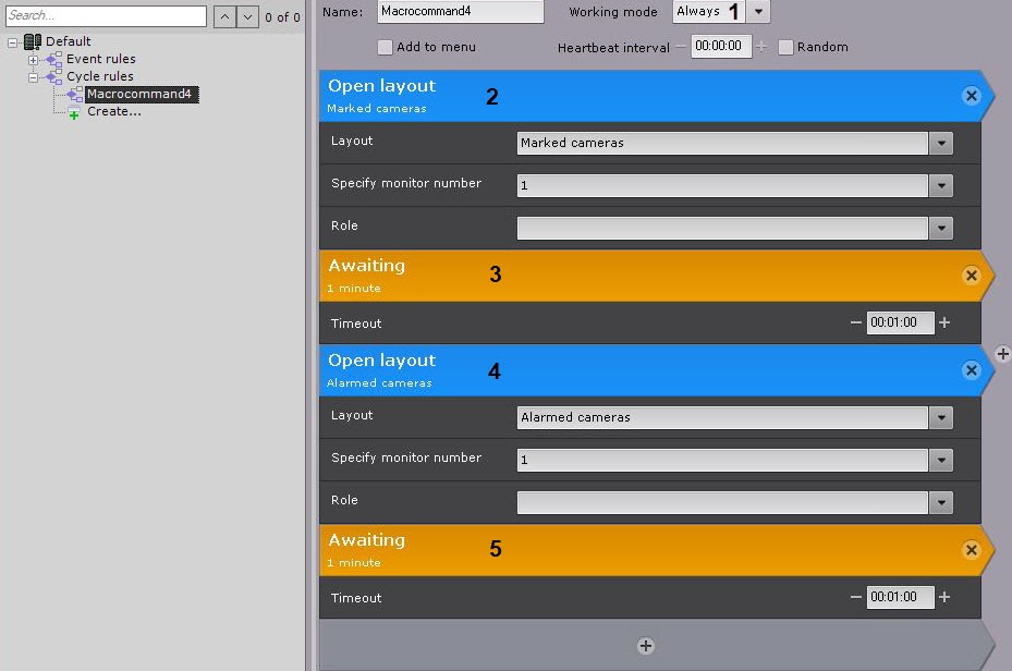The cycle consists of alternating layouts with marked cameras (2) and layouts with alarmed cameras (4). interval − 1 minute (3, 5).