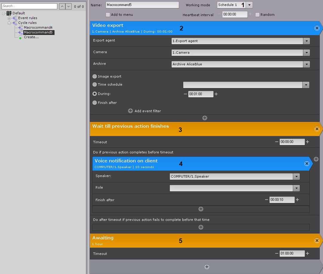 Every hour (5) video from camera 1 is exported (2). After the export is completed (3), an audio alert is sounded (4).