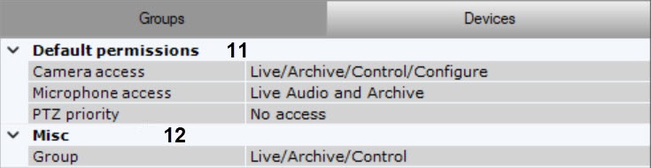 On the Groups tab, configure the group permissions if there are camera groups (12, see 비디오 카메라 그룹 구성).