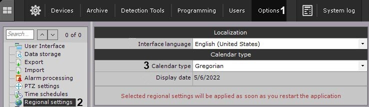 Axxon One을 다시 시작 하면 새로 선택한 달력 유형이 적용됩니다.