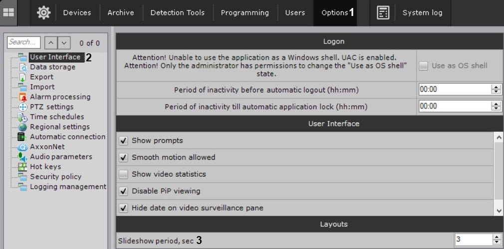 슬라이드쇼 모드는 할당된 빈도(체류 시간)에 따라 레이아웃을 주기적으로 전환하는 것입니다. 슬라이드쇼는 레이아웃 리본의 상황에 맞는 메뉴를 사용하여 시작됩니다.