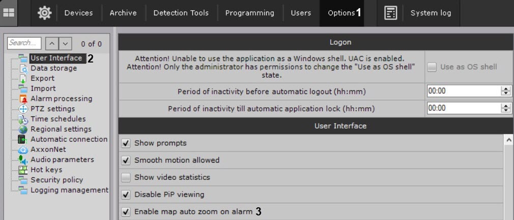 알람 시 맵 자동 확대가 구성됩니다. 알람이 발생하면 알람 카메라 아이콘이 확대된 맵 중앙에 배치됩니다.
