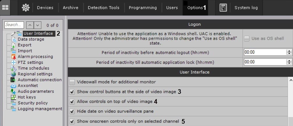 레이아웃의 활성 창에 대해서만 감시 창 요소를 표시해야 하는 경우 선택한 채널에만 화면 컨트롤 표시 확인란을 설정합니다 (5). 이 매개변수는 비디오 이미지 위에 컨트롤 허용 확인란이 설정된 경우에만 유효합니다 (4).