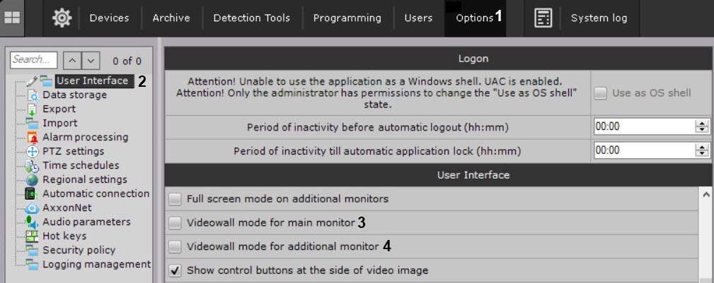 설정(Settings) → 옵션(Options) (1) → 사용자 인터페이스(User Interface) (2)로 이동합니다.