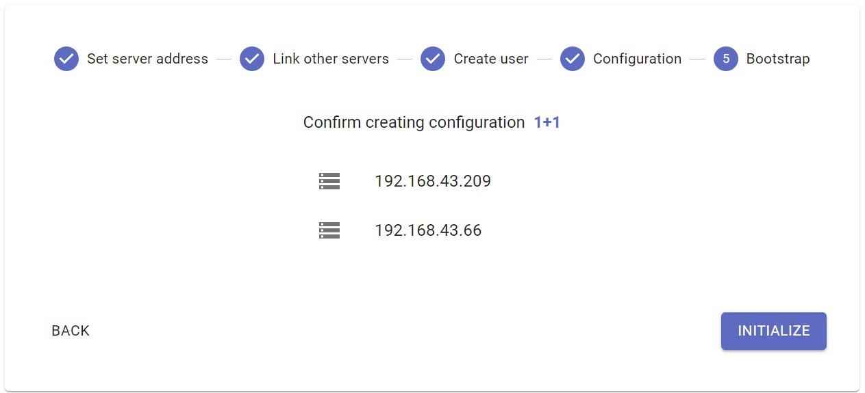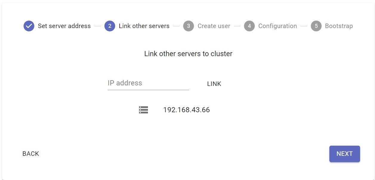 1+1 구성을 초기화하려면 구성에 두 번째 서버를 추가하세요. 이렇게 하려면 IP 주소를 입력하고 LINK(링크)를 클릭하세요.