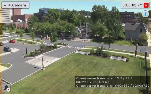 보기 타일에 비디오 통계를 표시할 수 있습니다 (비디오 통계 디스플레이 구성 섹션 참고). 실시간 모드에서는 비디오 디스플레이 통계가 표시됩니다. 알람, 아카이브 및 클립 검색 모드에서는 시청 중인 프레임의 시간과 재생 모드를 표시합니다.