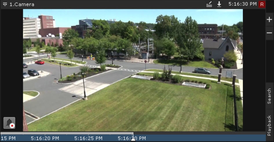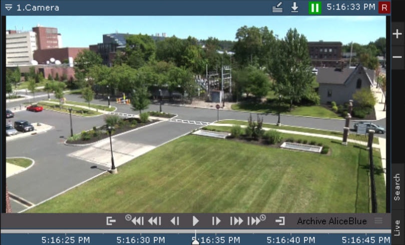 라이브 카메라 타일을 클릭하면 고급 탐색 패널에 타임라인과 아카이브 선택 버튼만 표시됩니다.