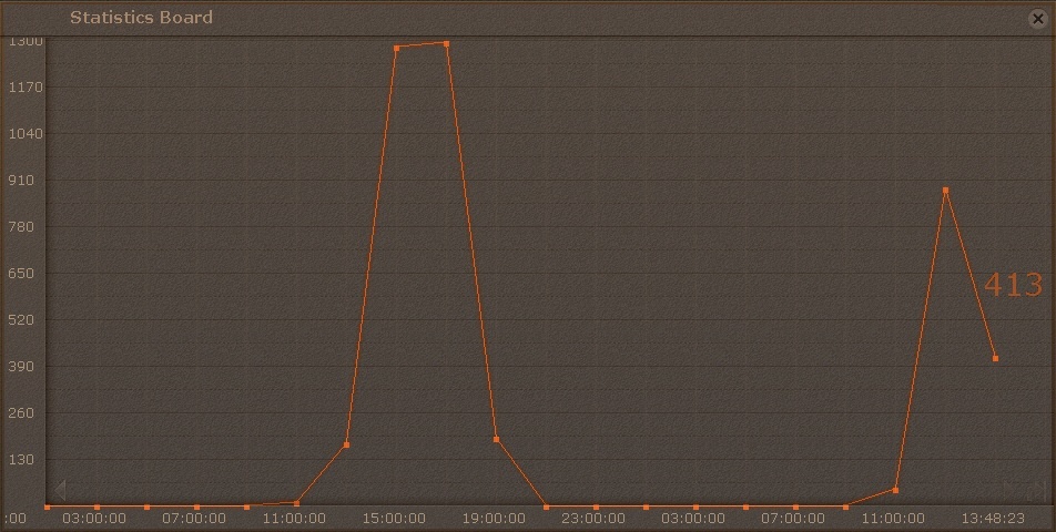 예를 들어, 시간 간격이 2 hours 이고 현재 시간이 1:48:23 p.m.인 이 그래프의 경우, 11:48:00 a.m. 부터 1:48:00 p.m 까지의 기간 동안 현재 이벤트 수는 413입니다.
