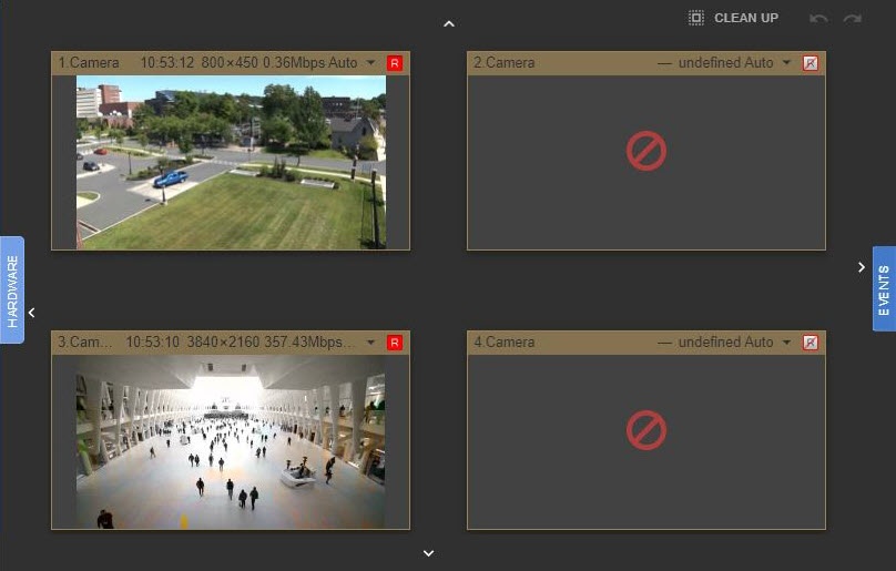 카메라 패널 목록에서 실시간으로 카메라의 비디오 이미지를 표시하는 레이아웃이 생성됩니다.