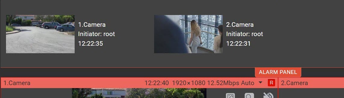 패널에는 알람이 발생한 카메라 이름, 알람을 시작한 사람, 알람 시간이 포함된 알람 축소판 그림이 표시됩니다.