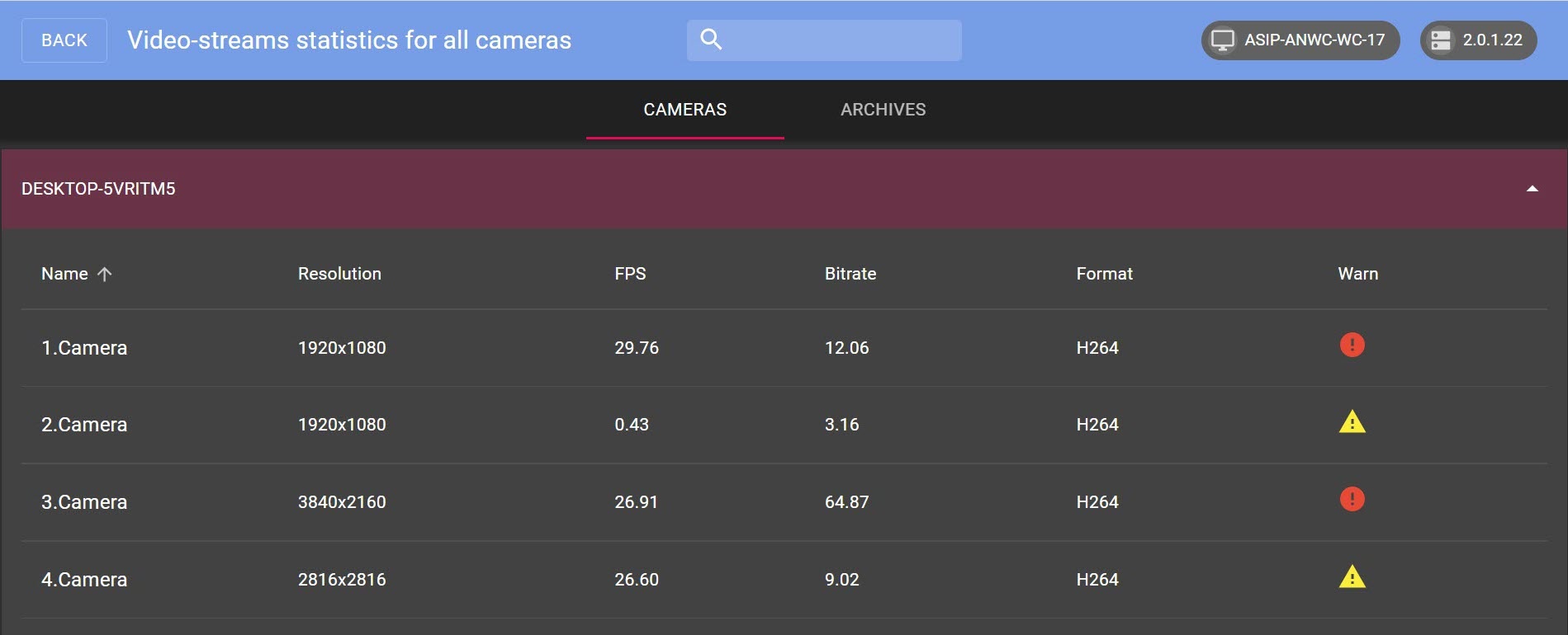 기본적으로 카메라 탭의 카메라는 이름순으로 정렬되지만 해상도, 프레임 속도, 비트 전송률, 형식 또는 경고순으로 오름차순 또는 내림차순으로 정렬할 수도 있습니다. 카메라를 특정 매개변수로 정렬하려면 매개변수 이름 위에 마우스를 올려놓고 위쪽 화살표 을/를 클릭합니다. 카메라가 오름차순으로 정렬된 경우 위쪽 화살표 로, 카메라가 내림차순으로 정렬된 경우 아래쪽 화살표 로 표시됩니다.