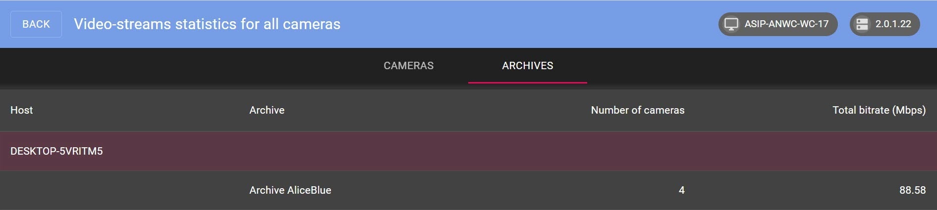 카메라 탭 에서는 각 카메라의 각 비디오 스트림에 대해 다음 매개변수가 표시됩니다.