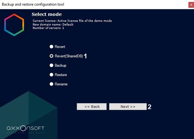 시스템은 Axxon 도메인의 글로벌 구성이 변경될 때(역할, 사용자, 맵, 레이아웃 등의 생성/삭제) 복원 지점을 만듭니다. 언제든지 사용 가능한 복원 지점으로 구성을 롤백할 수 있습니다. 롤백 프로세스를 시작하려면 백업 및 복원 유틸리티의 메인 페이지로 이동(1)하고 스위치를 되돌리기(SharedDB) 위치로 설정합니다. 계속하려면 다음(Next) >> 버튼을 클릭합니다 (2).