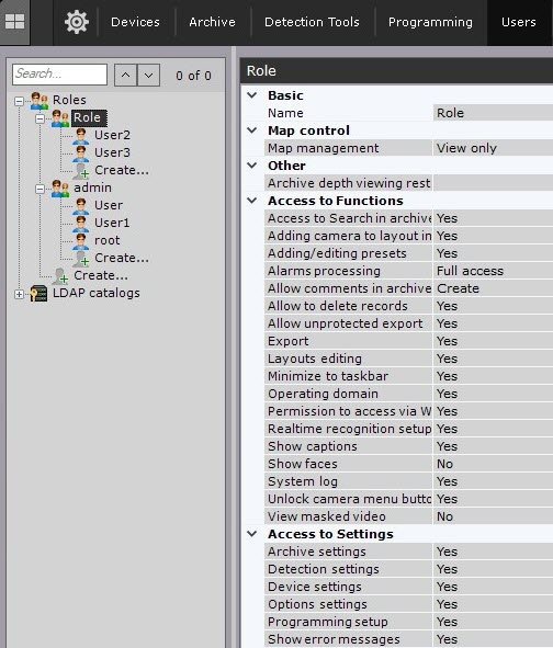 Axxon One의 모든 사용자는 역할에 따라 권한이 달라집니다.