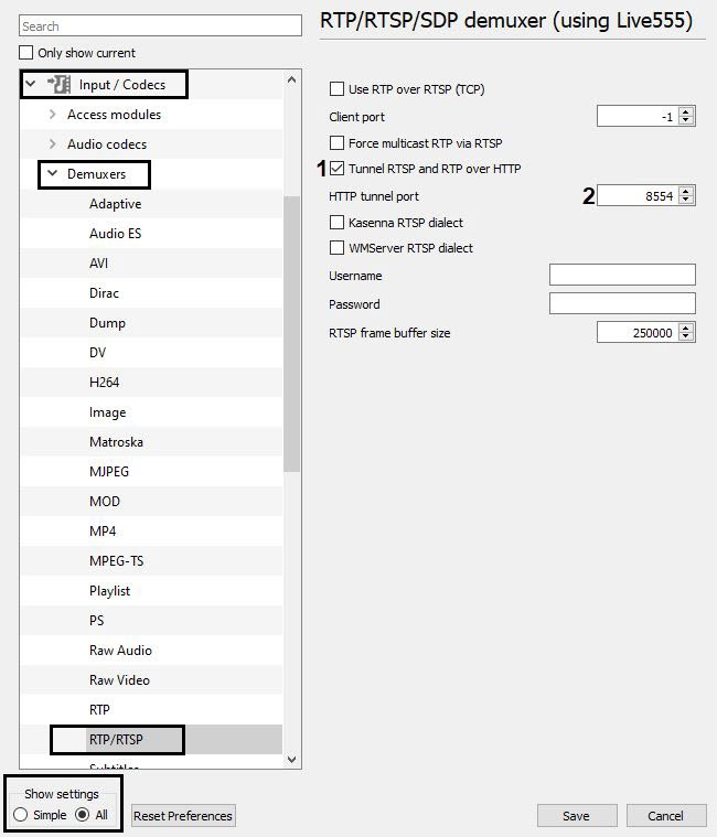 VLC에서 터널링을 설정하려면 Tunnel RTSP and RTP over HTTP 체크박스를 선택하고(1) 웹 서버 포트를 지정해야 합니다(2, 웹 서버 구성 참조).