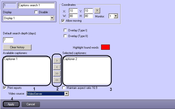 Alternatively, theand buttons are used to remove the selected or all captioners from the Selected captioners list.- Click Apply (4).