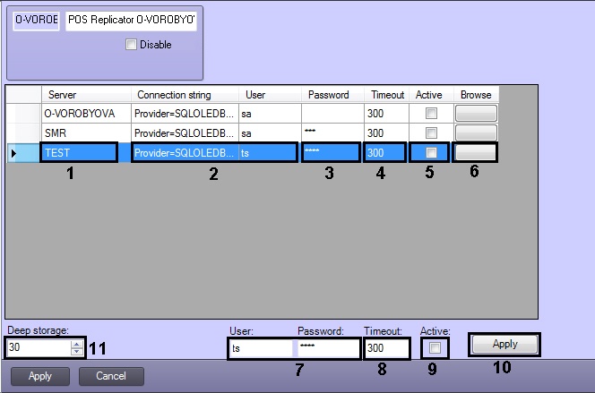 It is possible to specify following parameters for several Servers such way: user name and password of connection to the POS database, timeout and state of replication.