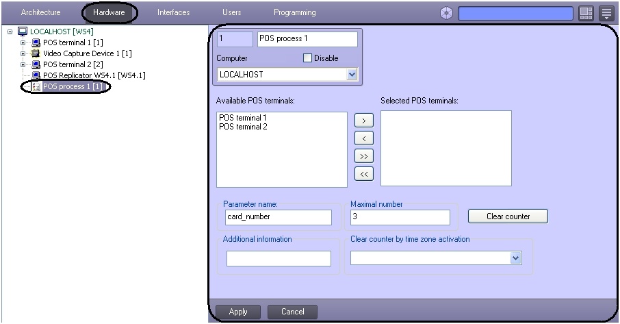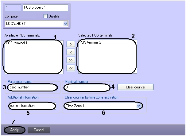 To back POS terminals from the Selected POS terminals list to the Available POS terminals list useand buttons.- In the Parameter name field enter the name of parameter at which the number of equal values is to be controlled (3). Parameter name is depends on protocol characteristics on which the terminal works.