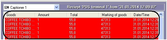 To view search results, select the tab of a POS-terminal, then select a transaction in the search results table. The number of the selected POS-terminal and the date/time of the selected transaction are displayed in the search results header.