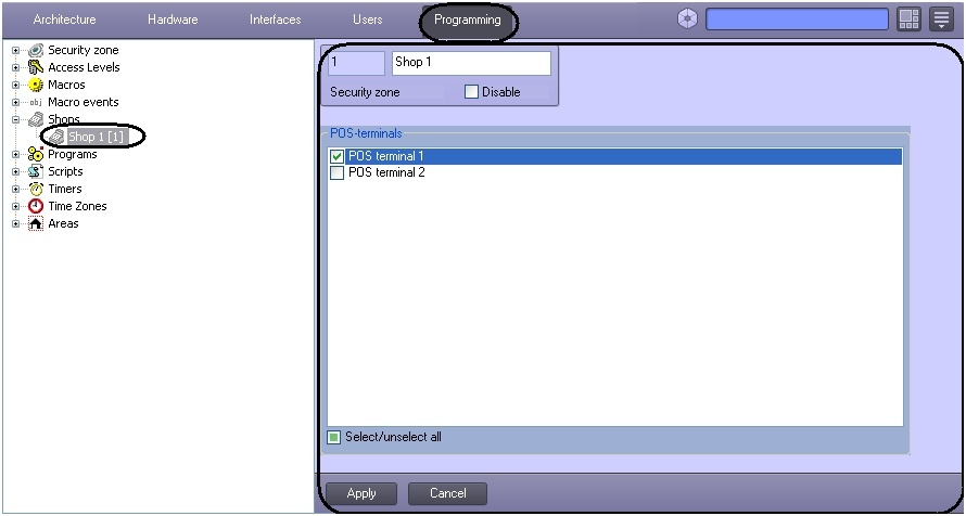 Creation and setup of the Shop system object is carried out on Programming tab of System setting dialog box