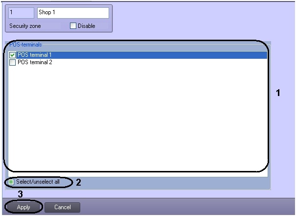 If it’s necessary to remove the selection of all POS-terminals remove Select/unselect all checkbox by clicking it once again.- Click Apply to save the changes (3).