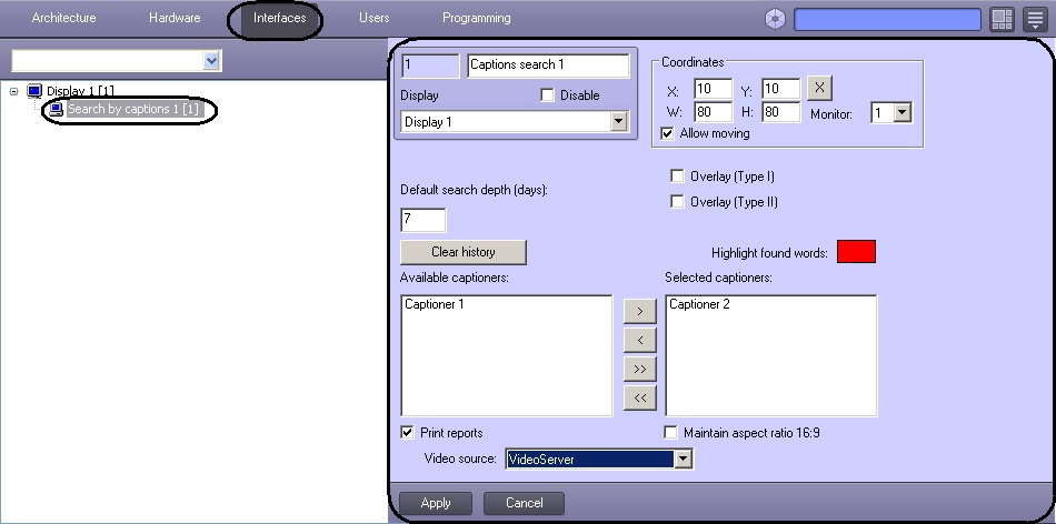 To create and set up the Search by captions object, go to the Interfaces tab in the System settings dialog window.