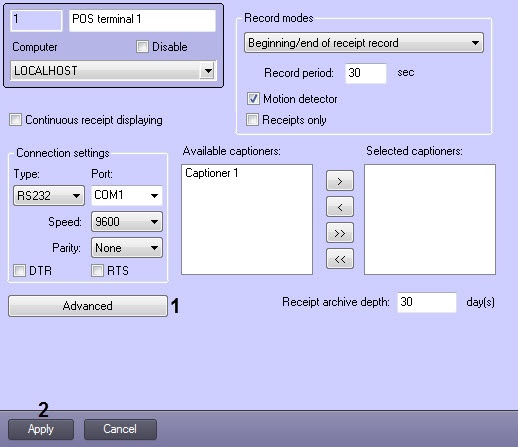 - Click the Apply button (2) on the POS terminal object settings panel.
