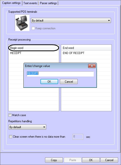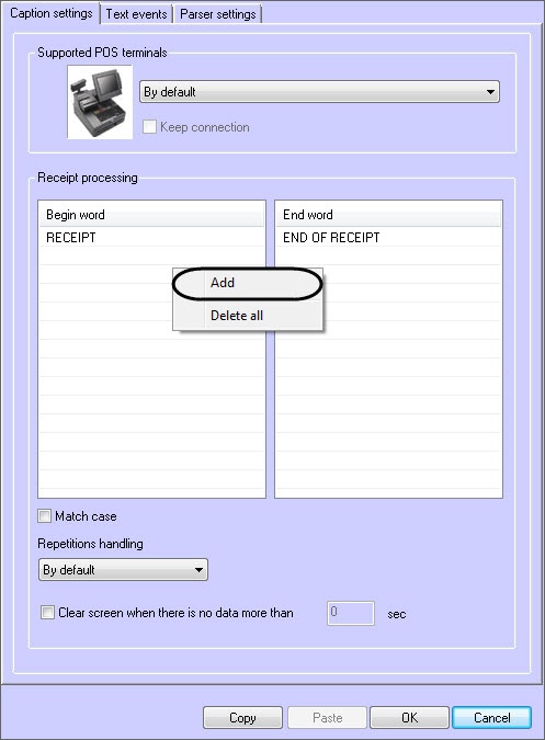 To modify the words in the table, right-click a word to open the drop-down menu, or use the Copy or Paste buttons.In the same way, specify the string of characters (words) denoting the end of a receipt. Right-click the End word column to open the drop-down menu, click Add, then enter the word in the dialog box that opens and click the OK button.