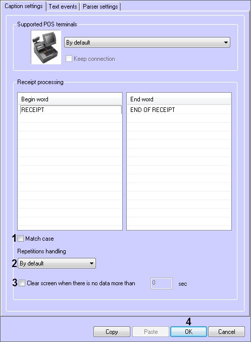 To recognize the receipts by the begin word only while ignoring end words, select the By default option in the Repetitions handling drop-down list.- To clear the captions display area after a certain amount of time if no data is received, set the Clear screen when there is no data more than checkbox, and enter the waiting time (in seconds) in the text field next to it (3).