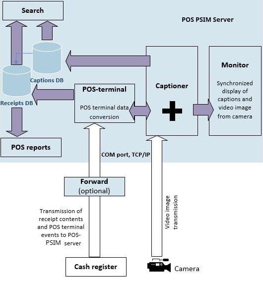 The POS-operations module uses the Captioner module, which is installed with Axxon PSIM (base) by default. Using the POS-terminal module, the Captioner module forms the receipts database; overlays the video image received from the surveillance camera with the receipt contents; adds the captioning results to the captioner, and displays the resulting video image via the Monitor interface object.