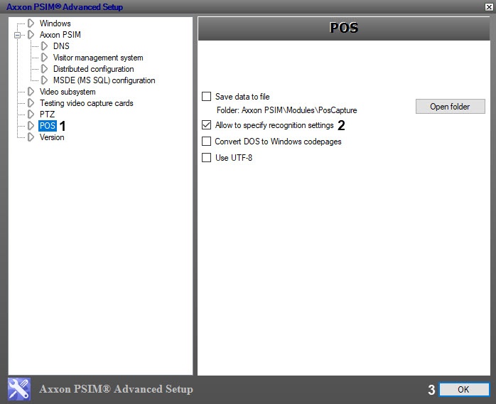 2. Go to the settings panel of POS section dialog window Axxon PSIM Advanced Setup (1).