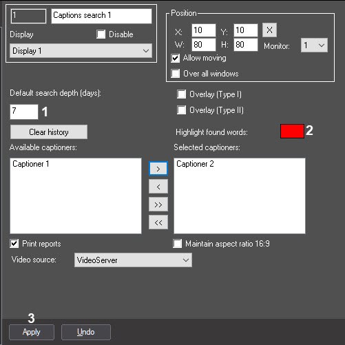 To set up the captioner search, the following parameters should be specified: