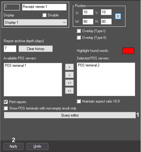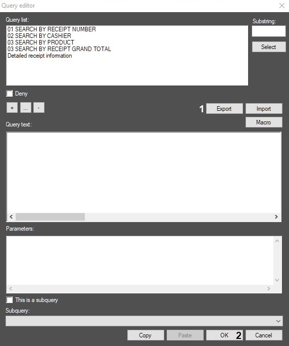 Warning! The user query in the Receipt viewer window will be created and processed, only if the receipts parser has been set up (see the Setting up the parser (optional) section).