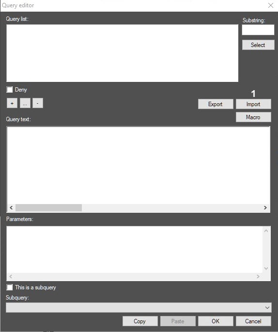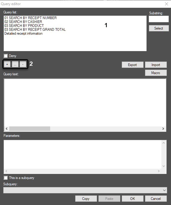 1 | Query list | List, items imported or edited using the editing buttons | List of queries | Names of existing queries | - | Depends on the number of existing queries |