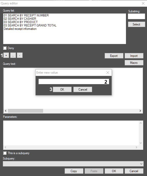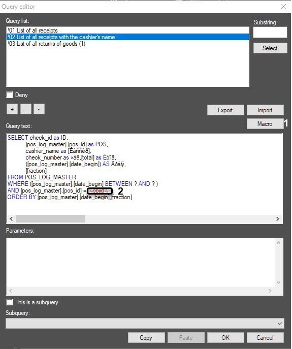 2 | Deny | Checkbox | Hides the query in the Receipt viewer window | Boolean | No | Yes — the query is not displayed in the Receipt viewer window. No — the query is displayed |