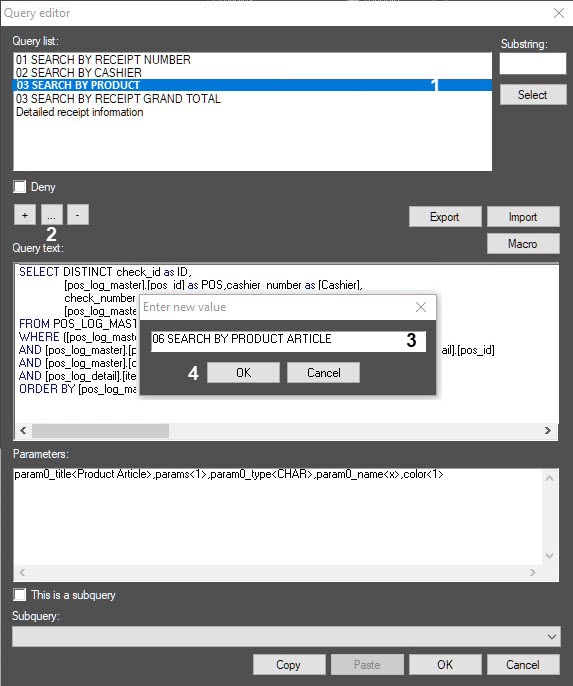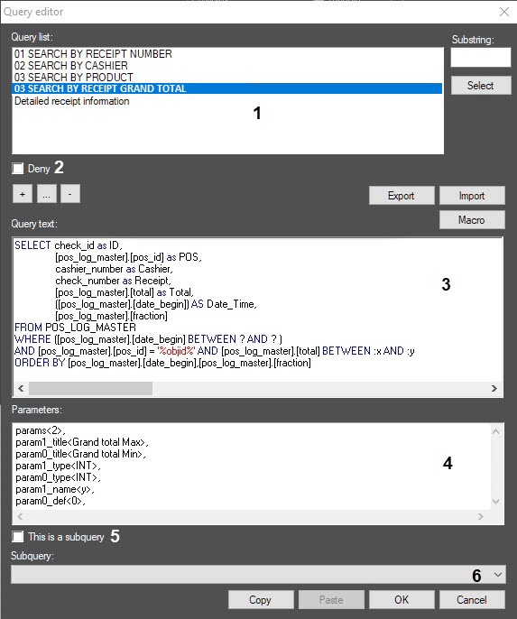 4 | Parameters | Text field | Query parameters | SQL language | - | - |